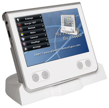 Tabbee c'est quoi ? Tabbee est avant tout une tablette multimédia qui permet de se connecter à internet grâce à sa connexion Wifi. Son navigateur internet Opéra lui permet de gérer au mieux la plupart des sites web, même lors de l'utilisation poussée de Javascript. On notera quand même que le module flash ne gère pas les sites utilisant Flash 9 ou supérieure. Des sites comme Youtube, ou Dailymotion sont parfaitement reconnus et permettent ainsi de lire les vidéos directement sur le Tabbee. Contrairement à un écran tactile classique, le Tabbee est totalement autonome. Sa connexion wifi le libère de tous ses fils. Vous pouvez ainsi utiliser le Tabbee depuis votre cuisine, votre canapé... Le design moderne de la tablette permet de le positionner n'importe où dans votre maison, et il pourra alors devenir un outil incontournable à utiliser chaque jour. Pour écouter de la musique, afficher des informations ou voir vos plus belles photos sous formes de diaporama... Comment utiliser Tabbee en domotique ? Grâce au navigateur Opéra, il est possible d'accéder à n'importe quel logiciel de domotique proposant une interface Web. Vous pourrez par exemple piloter votre logiciel Homeseer sans avoir besoin de créer une interface particulière. Vous aurez aussi la possibilité d'accéder à des périphériques comme le Omizzy ou l'Axiophone IP de Legrand. Mais le plus intéressant avec le Tabbee est de développer une interface spécifique adaptée à votre maison et adaptée à la navigation tactile. Le gros avantage du Tabbee par rapport à un écran tactile : La mobilité ! |
